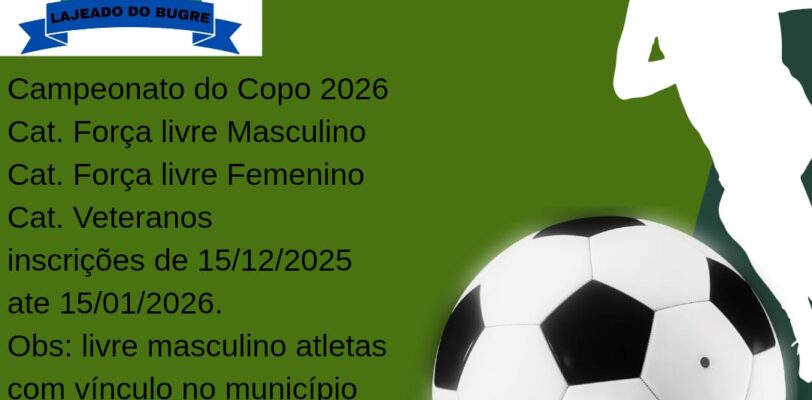 A Prefeitura de Lajeado do Bugre, por meio do CMD, está organizando a 3ª edição do Campeonato de Futsal do Copo. Os interessados podem se inscrever até o dia 15 de janeiro, mediante os seguintes critérios: Categoria livre … Leis mais…