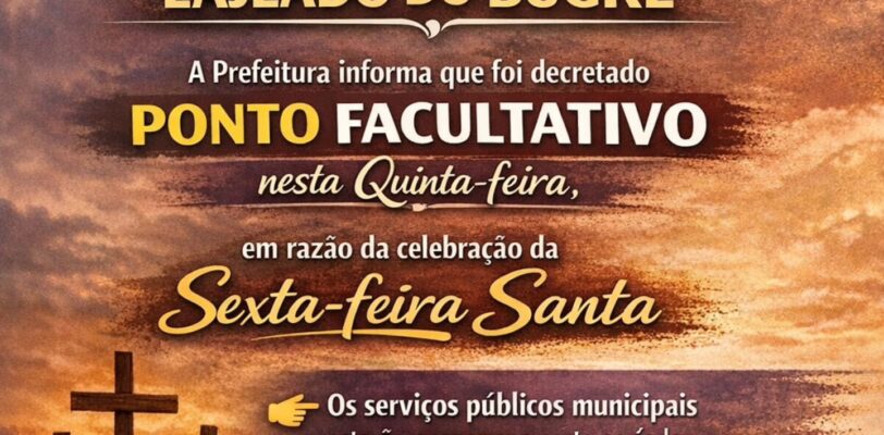 A Prefeitura informa que foi decretado ponto facultativo nesta quinta-feira, em razão da celebração da Sexta-feira Santa. Os serviços públicos municipais estarão suspensos neste período. O atendimento será retomado normalmente na próxima segunda-feira. Contamos com a compreensão de todos. … Leis mais…