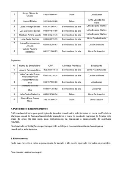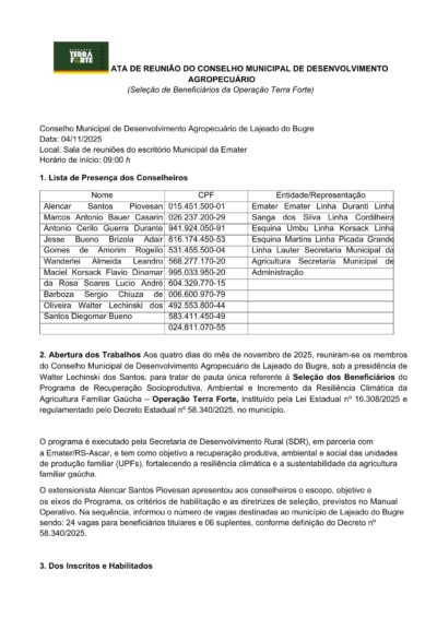Na terça-feira da semana passada, dia 4, o Conselho Municipal de Desenvolvimento Agropecuário de Lajeado do Bugre anunciou quem foram os produtores escolhidos para participar do Programa Operação Terra Forte.