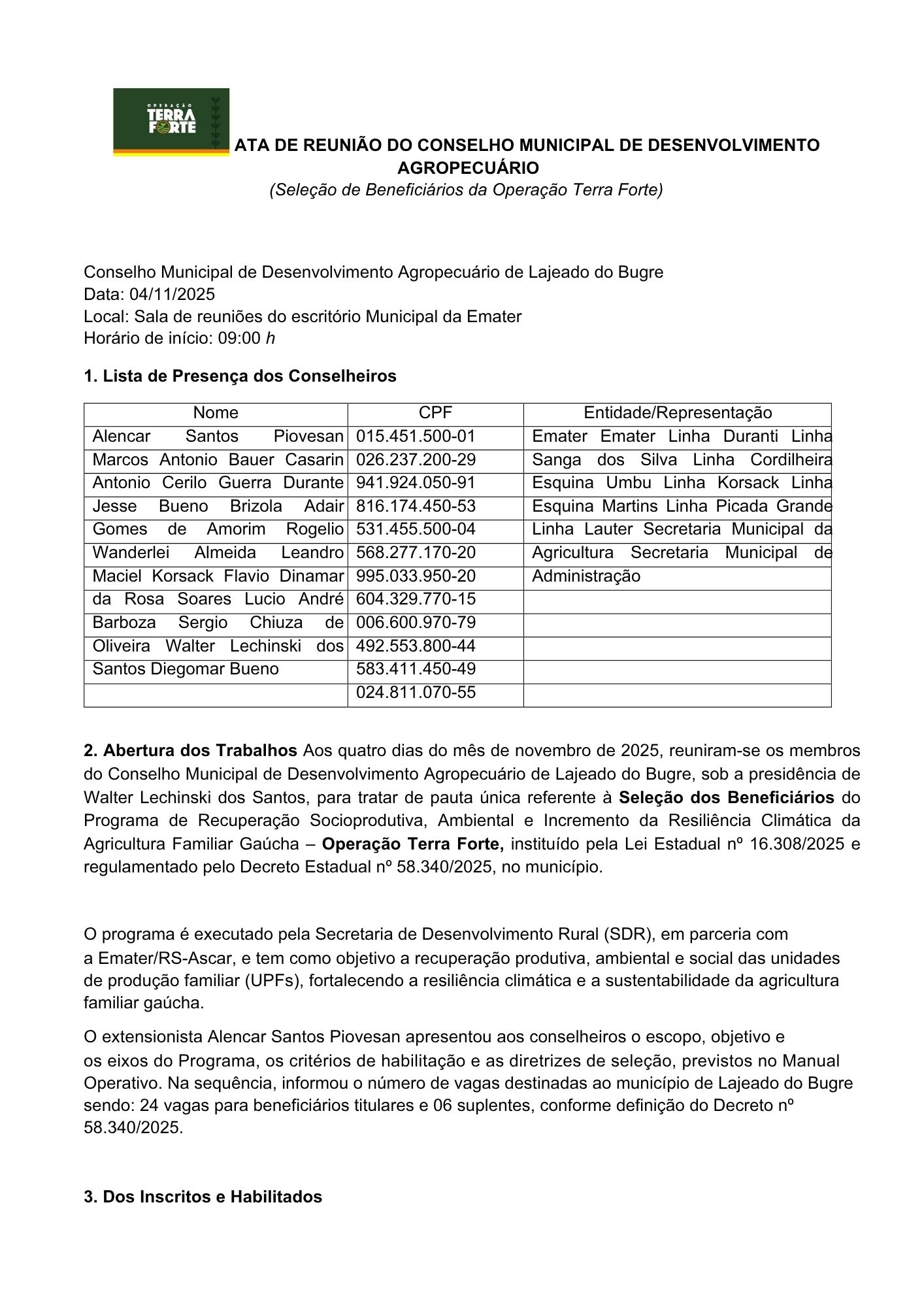Na terça-feira da semana passada, dia 4, o Conselho Municipal de Desenvolvimento Agropecuário de Lajeado do Bugre anunciou quem foram os produtores escolhidos para participar do Programa Operação Terra Forte.