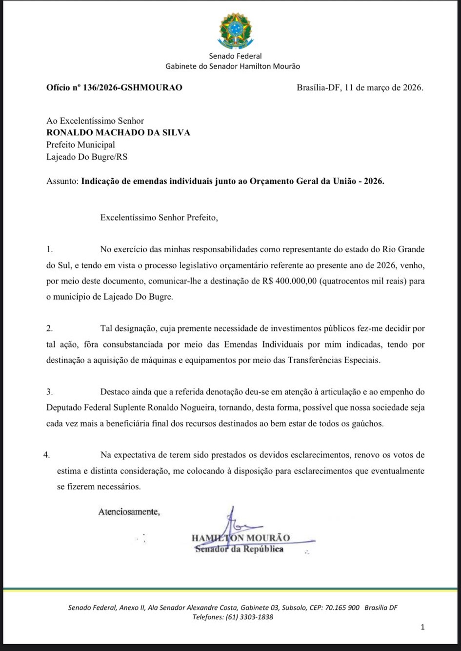 O município de Lajeado do Bugre foi contemplado com uma emenda parlamentar no valor de R$ 400 mil, destinada por meio do senador Hamilton Mourão. A confirmação do recurso ocorreu no mês passado, durante a entrega de um ofício realizada pelo suplente de deputado federal Ronaldo Nogueira.