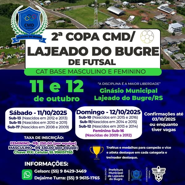 Neste final de semana, nos dias 11 e 12 de outubro, o Ginásio Municipal de Lajeado do Bugre Arminio Cenci será palco da 2ª Copa CMD de futsal de base, que reunirá 11 equipes de várias categorias.