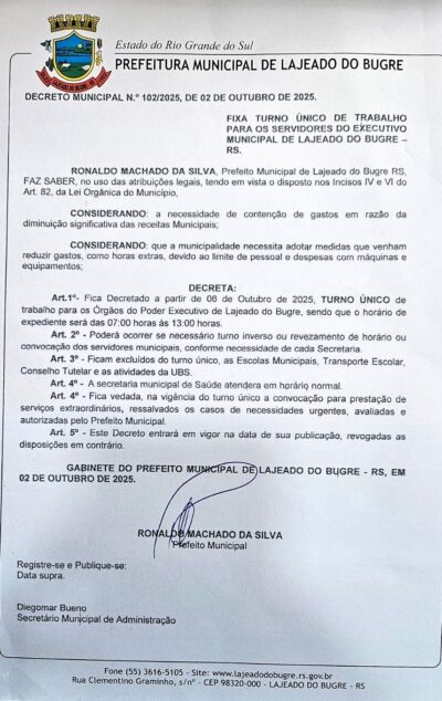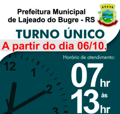 A administração municipal de Lajeado do Bugre instituiu um horário especial de funcionamento nas repartições públicas municipais. O regime de turno único terá início na próxima segunda-feira, dia 6 de outubro, e vigorará das 7h às 13h.
