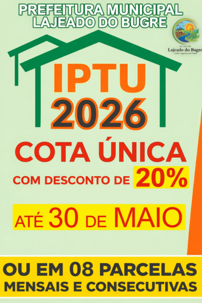 A Prefeitura de Lajeado do Bugre, por meio da Secretaria Municipal da Fazenda, informa aos contribuintes que já está disponível para pagamento a guia do IPTU 2026 (Imposto sobre a Propriedade Predial e Territorial Urbana).