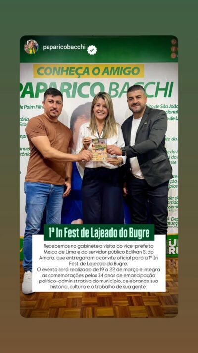 Na oportunidade, o vice-prefeito também aproveitou para divulgar e reforçar o convite para o Lajeado do Bugre Fest (14, 19, 20, 21 e 22 de março) destacando a importância do evento para a valorização cultural, o incentivo ao turismo local e o fortalecimento da economia do município.